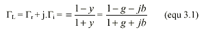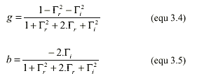 在前面的讨论中,我们看到阻抗圆图上的每一个点都可以通过以复平面原点为中心旋转180°后得到与之对应的导纳点。于是,将整个阻抗圆图旋转180°就得到了导纳圆图。这种方法十分方便,它使我们不用建立一个新图。所有圆周的交点(等电导圆和等电纳圆)自然出现在点(-1, 0)。使用导纳圆图,使得添加并联元件变得很容易。在数学上,导纳圆图由下面的公式构造: