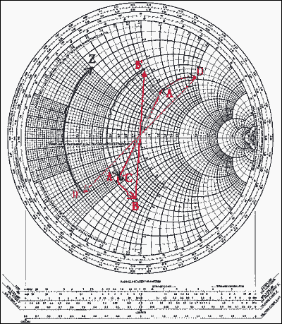 B''''''''必需和D位于同一个电阻圆上。从图形上看,从A''''''''到D只有一条路径,但是如果要经过中间的B点(也就是B''''''''),就需要经过多次的尝试和检验。在找到点B和B''''''''后,我们就能够测量A''''''''到B和B''''''''到D的弧长,前者就是C的归一化电纳值,后者为L的归一化电抗值。A''''''''到B的弧长为b = 0.78,则B = 0.78 x Yo = 0.0156姆欧。因为C = B,所以 C = B/ω= B/(2 πf) = 0.0156/(2 π607) = 41.4pF。B到D的弧长为 x = 1.2,于是 X = 1.2 × Zo = 60Ω.由L = X, 得 L = X/ω = X/(2 πf) = 60/(2 π607) = 159nH。
