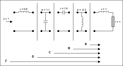 考虑图8所示网络(其中的元件以Zo=50进行了归一化)。串联电抗(x)对电感元件而言为正数,对电容元件而言为负数。而电纳(b)对电容元件而言为正数,对电感元件而言为负数。